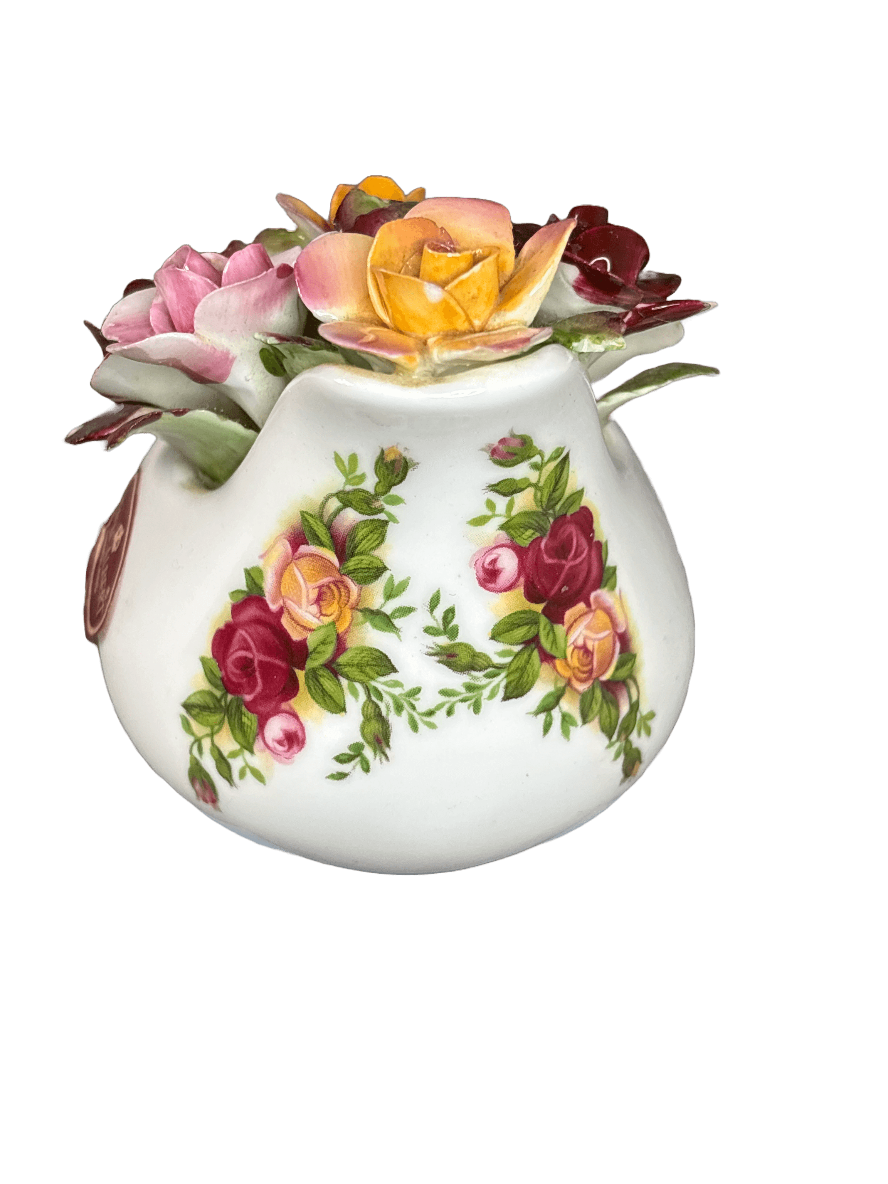 A decorative Royal Albert porcelain posy bowl from the Old English Rose collection. The piece features transfer-printed rose garlands around a rounded, bulbous bowl form, complemented by a sculptural arrangement of applied porcelain flowers in soft pink, cream and burgundy tones. Designed primarily for ornamental display rather than functional use.