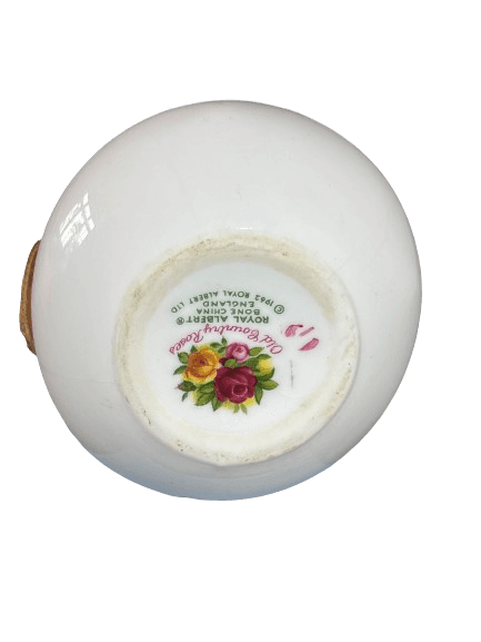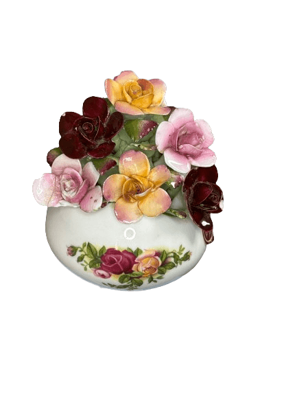 Royal Albert’s Old English Rose collection includes a range of decorative giftware produced during the late 20th century, often featuring applied floral elements and romantic printed decoration. Such pieces were commonly made as display bowls or table ornaments rather than practical vases.